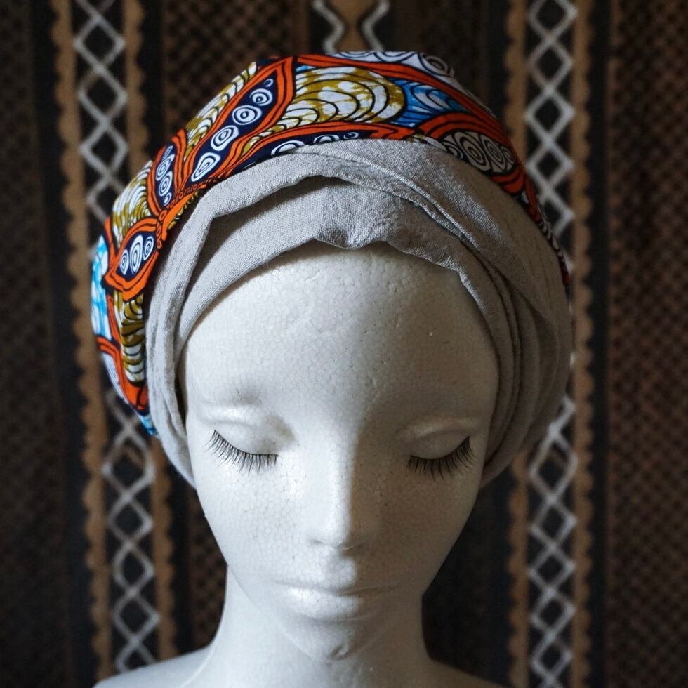 アフリカ布帽子ターバン・生成り×オレンジ花/BAOBAB